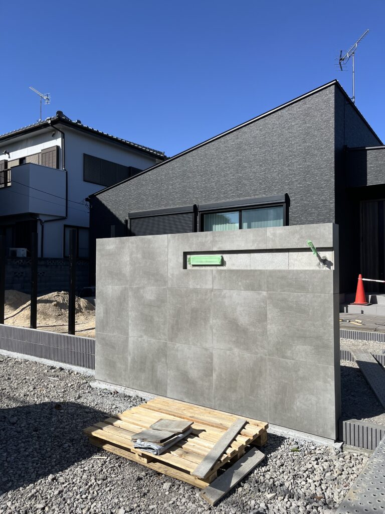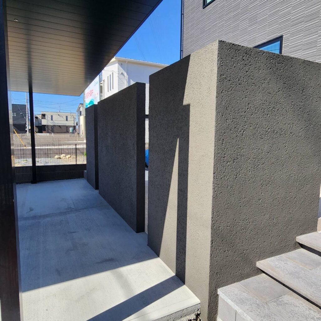 濃いめの色でコントラストを付けて、インターホンカバーと表札とポストになります。