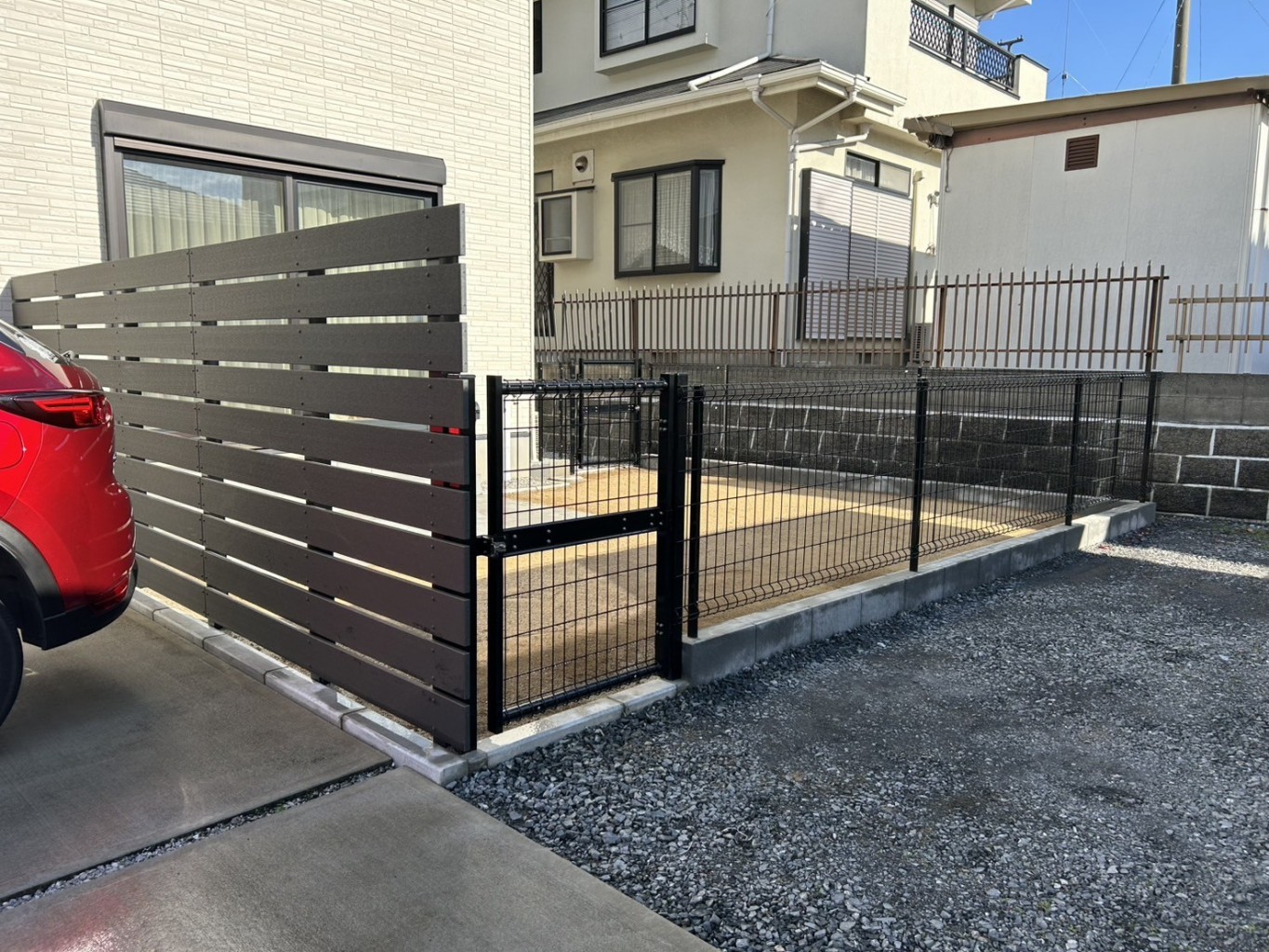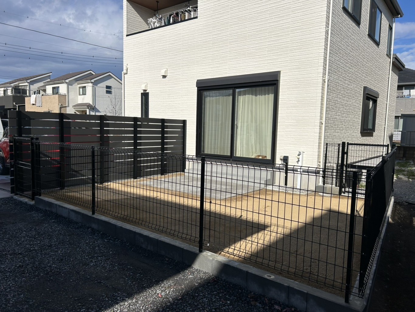 目隠しフェンスの柱も設置しましたので、根巻きコンクリートと土間コンクリート打設を同時に行います。